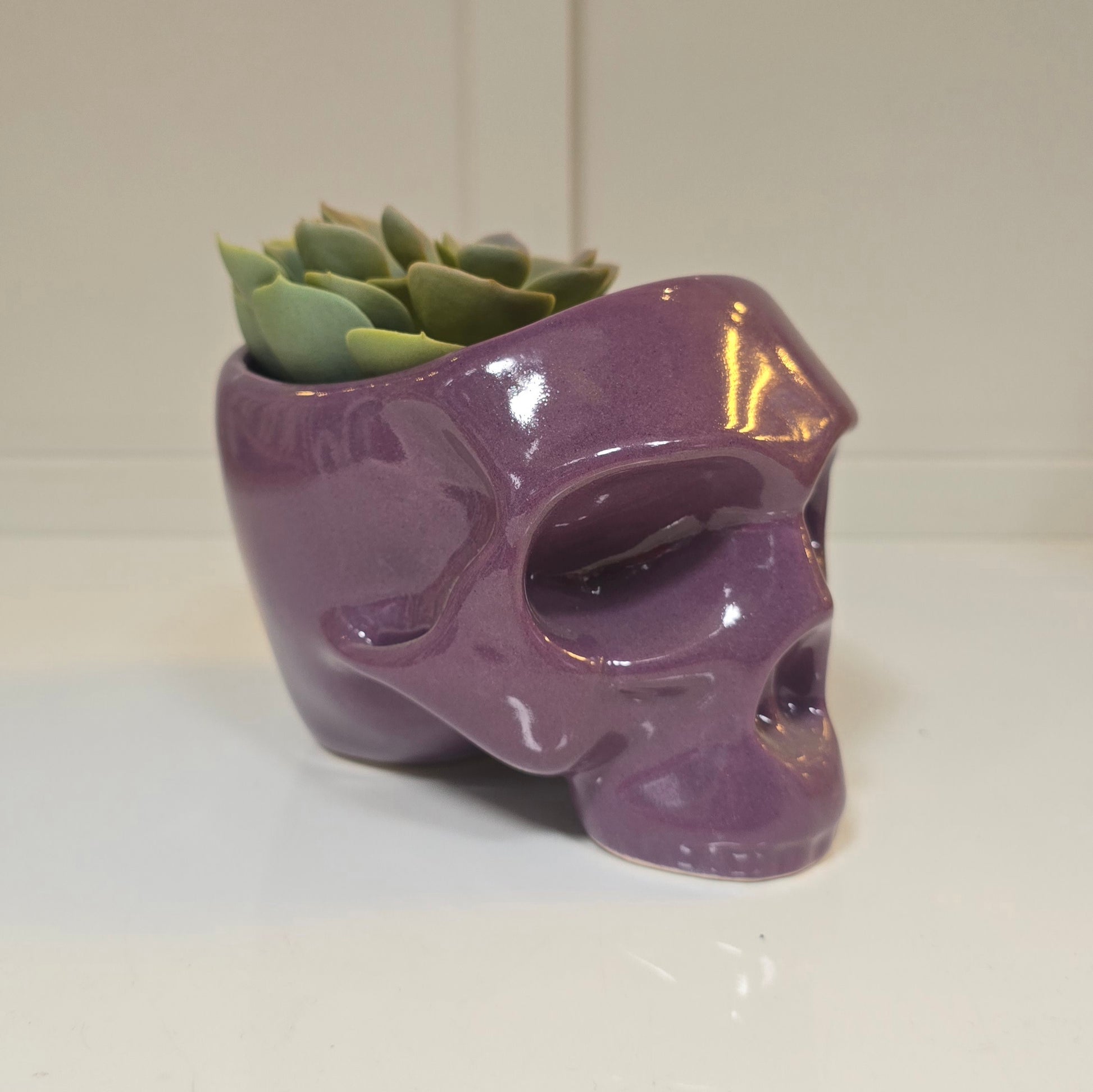 Una calavera... pero con glitter en el alma. Esta maceta en tono lila brillante tiene toda la actitud alternativa y un giro pop encantador. Su forma anatómica, su brillo suave y ese color tan fuera de lo común la hacen irresistible para quienes aman lo excéntrico y estético. Fabricada en cerámica pintada y horneada para durar y brillar por siempre.