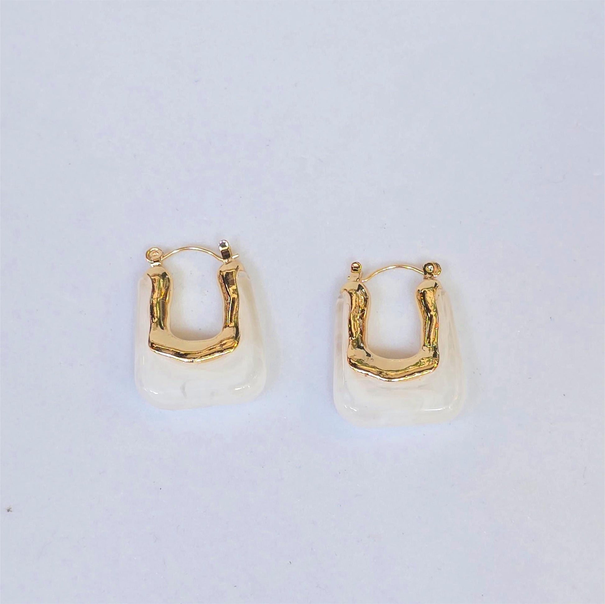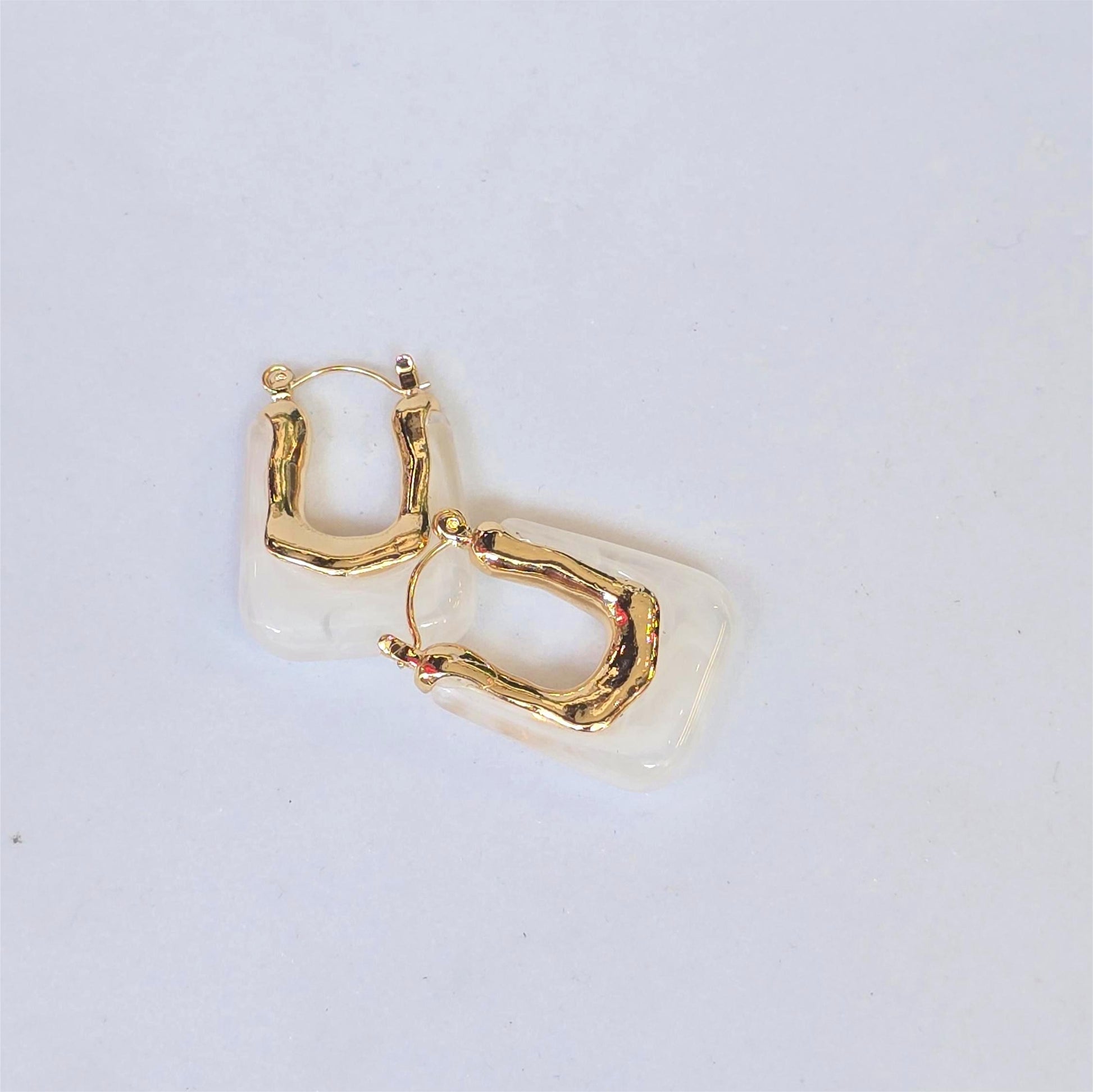 Estos aretes en forma de U combinan una base acrílica en blanco con efecto mármol y una pieza dorada con acabado texturizado. El diseño es contemporáneo y elegante, perfecto para quienes aman los detalles únicos pero neutros.