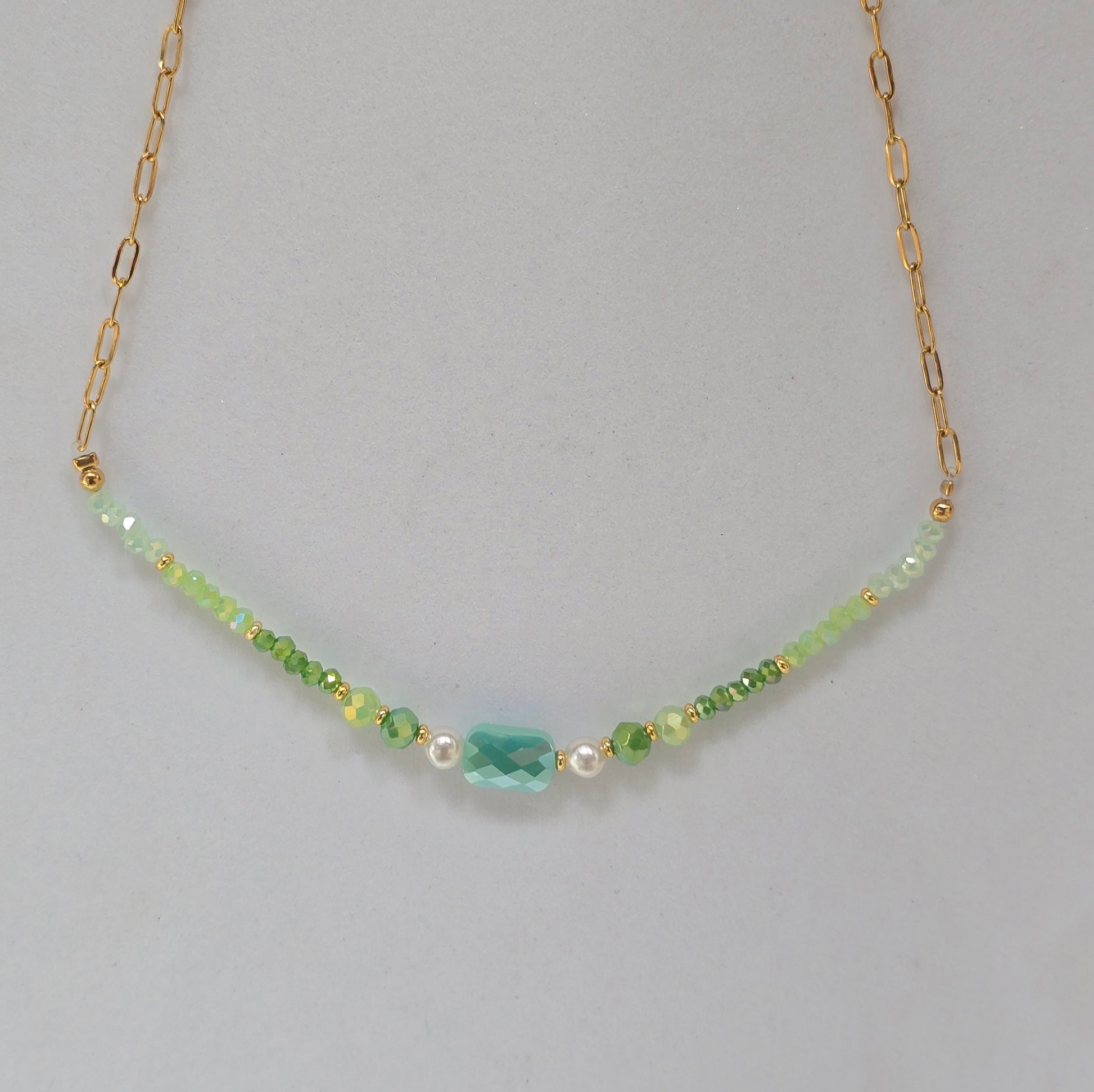 Una joyita en tonos verdes, con un centro facetado que atrapa la luz. Elegante pero relajado, ideal para todos los días.
