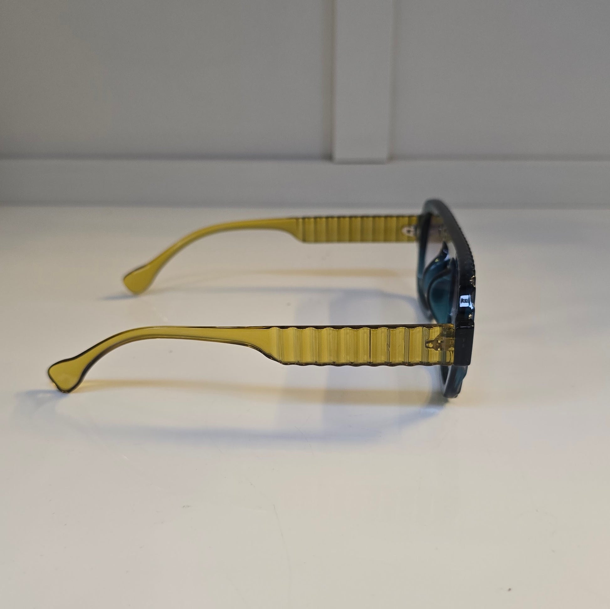 No son lentes, son una declaración. El modelo "Galáctica" combina un diseño estructurado y fuera de lo común: frente azul con textura ondulada, patitas amarillas con relieve y micas con reflejo sutil que cambian según la luz.