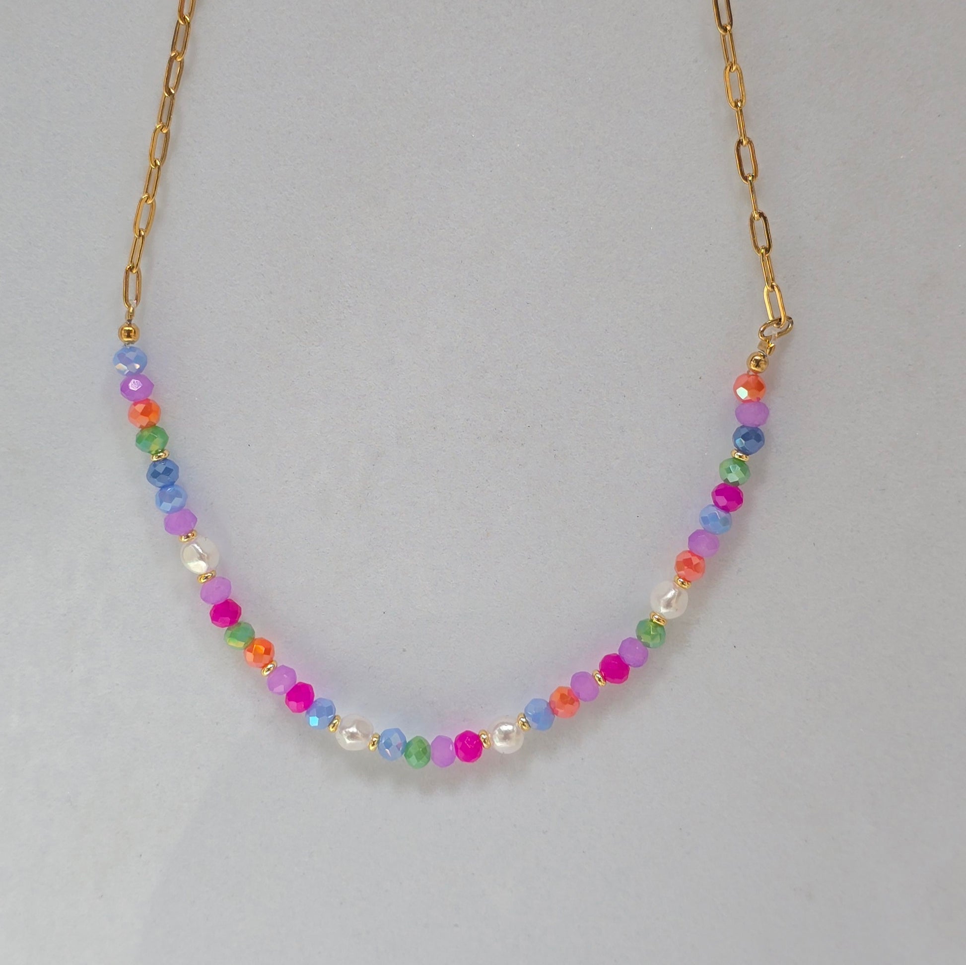 Un diseño lleno de vida con cuentas facetadas en todos los colores del arcoíris, combinadas con perlitas que le dan un toque delicado.