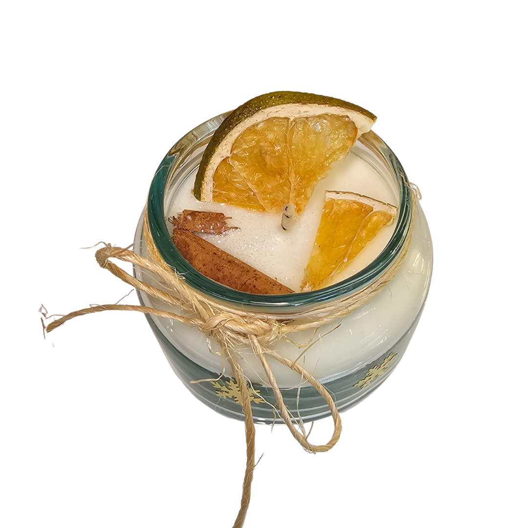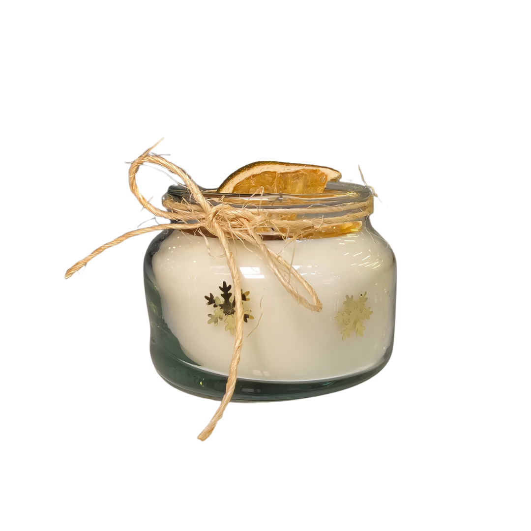 Vela en frasco con detalles de copitos de nieve, el moñito de rafia le da un toque natural y acogedor, ideal para regalar o decorar en invierno.