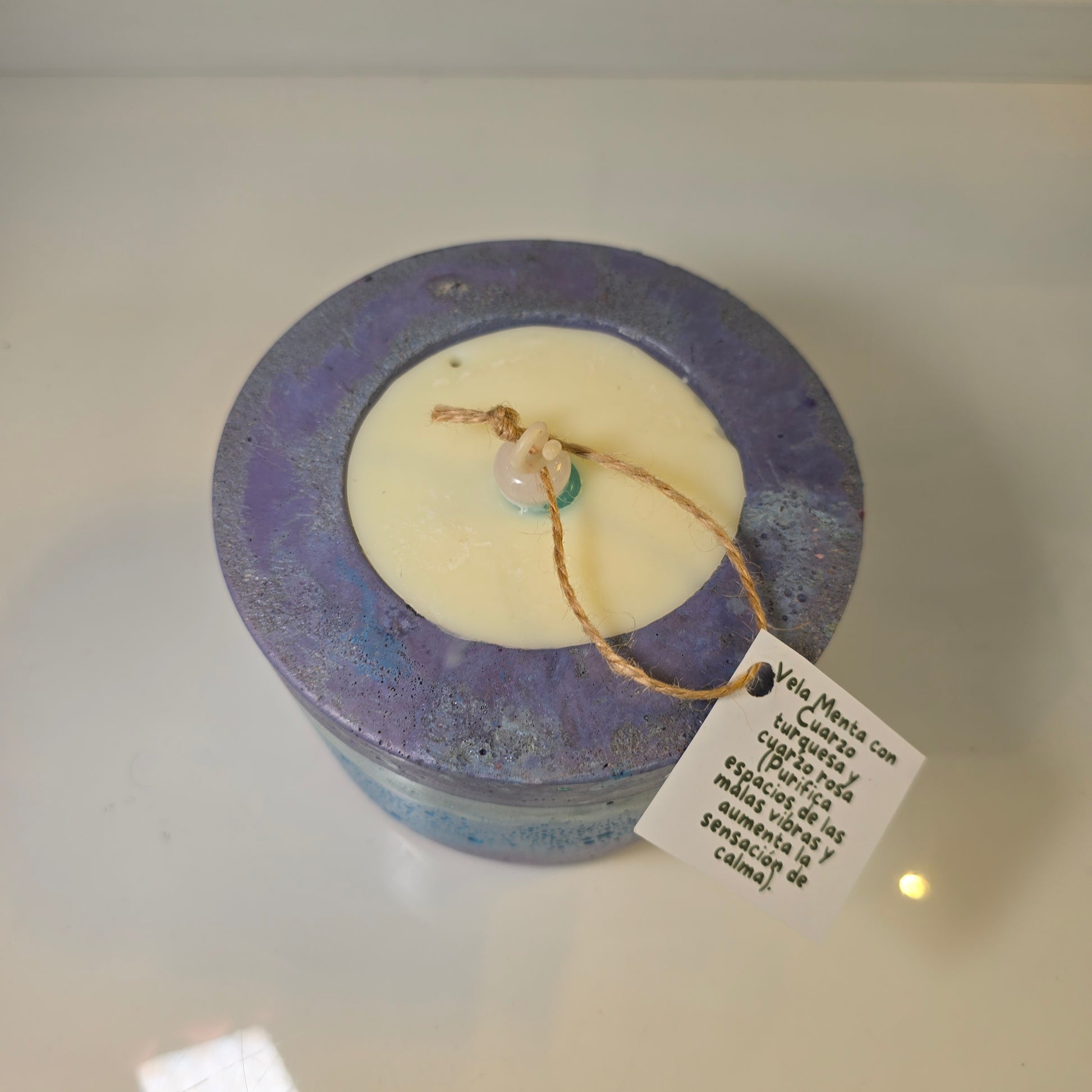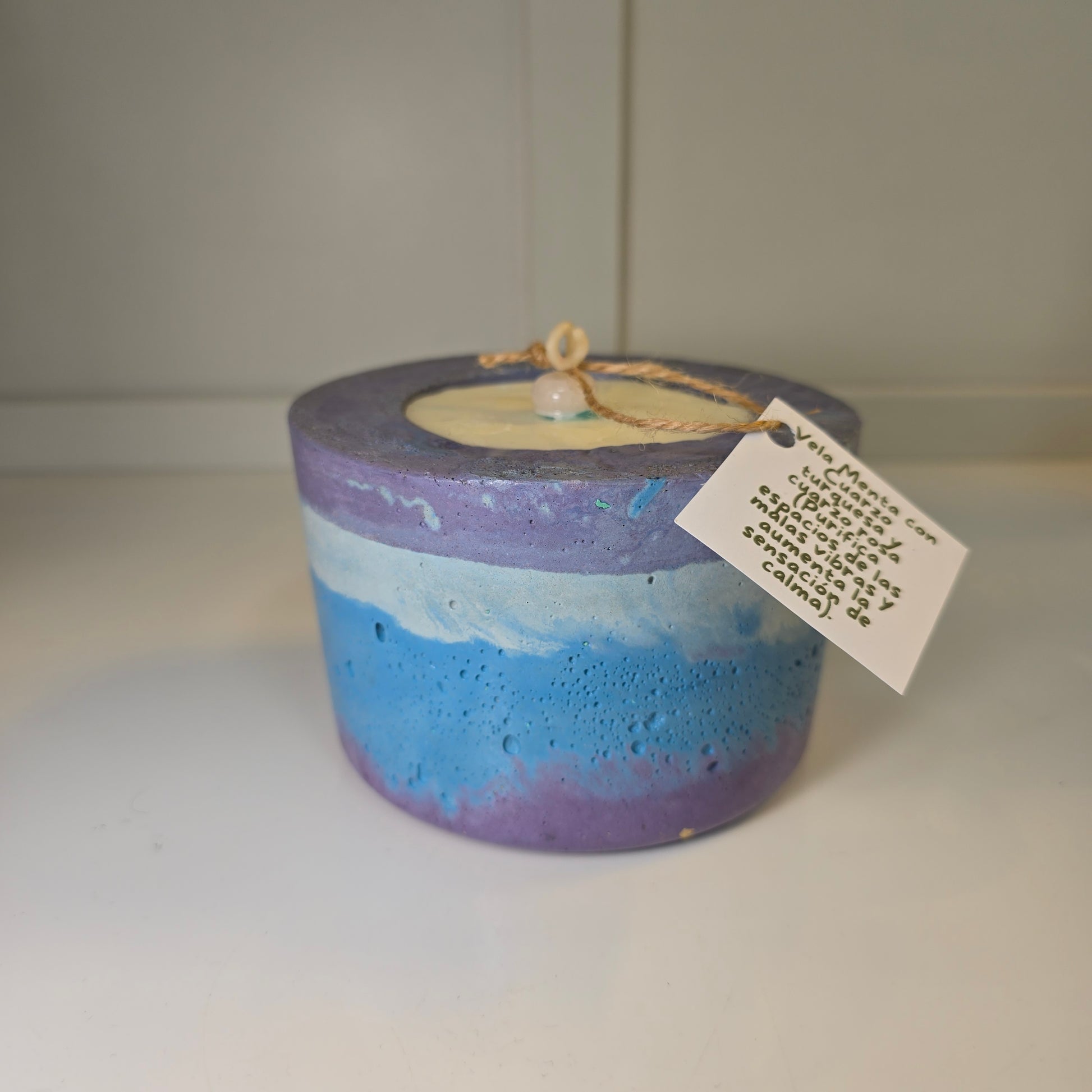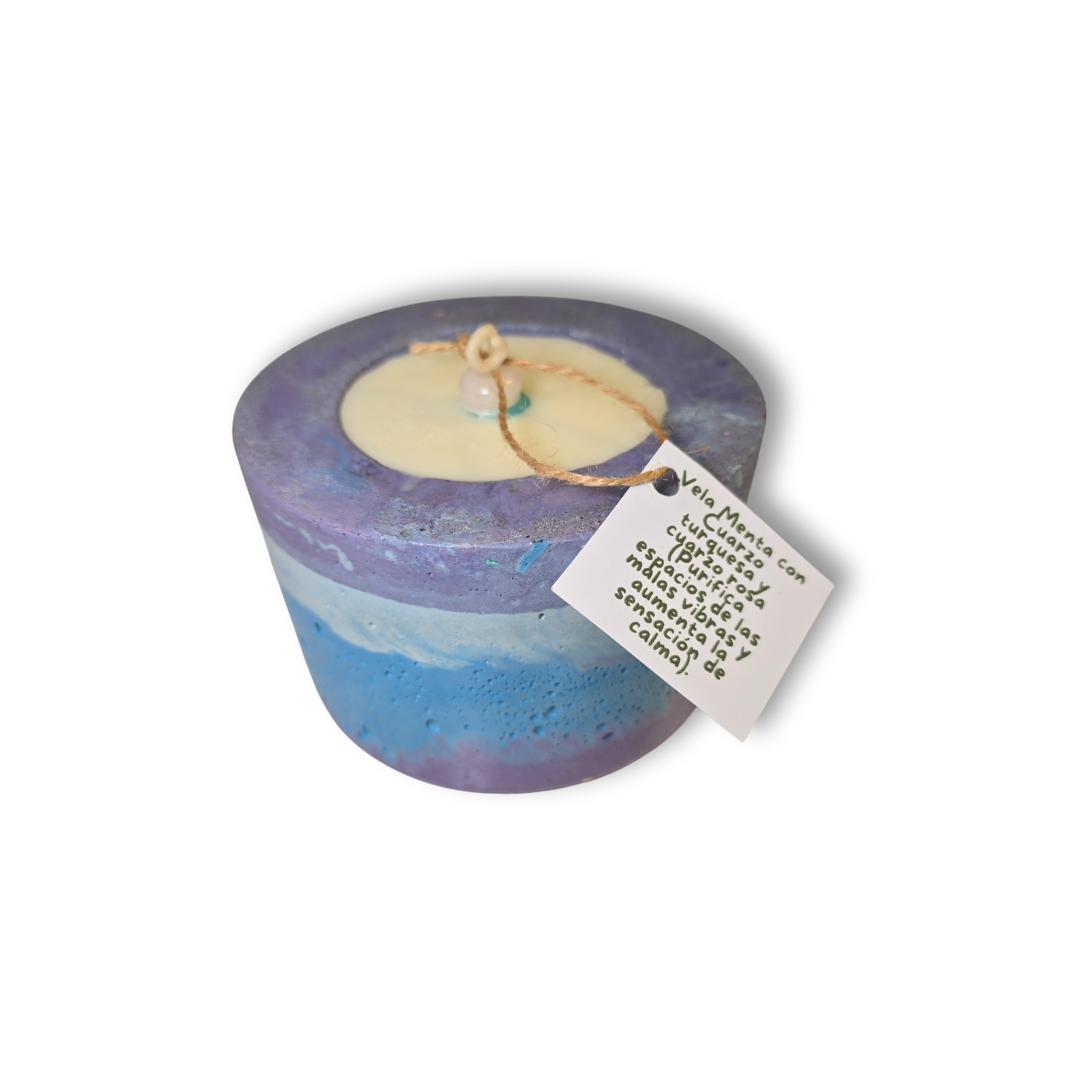 Una vela fresca, con aroma a menta y cuarzos que purifican el ambiente, elevan las vibraciones y promueven calma profunda. Su base lila y azul es de concreto hecho a mano, ideal para reutilizar.